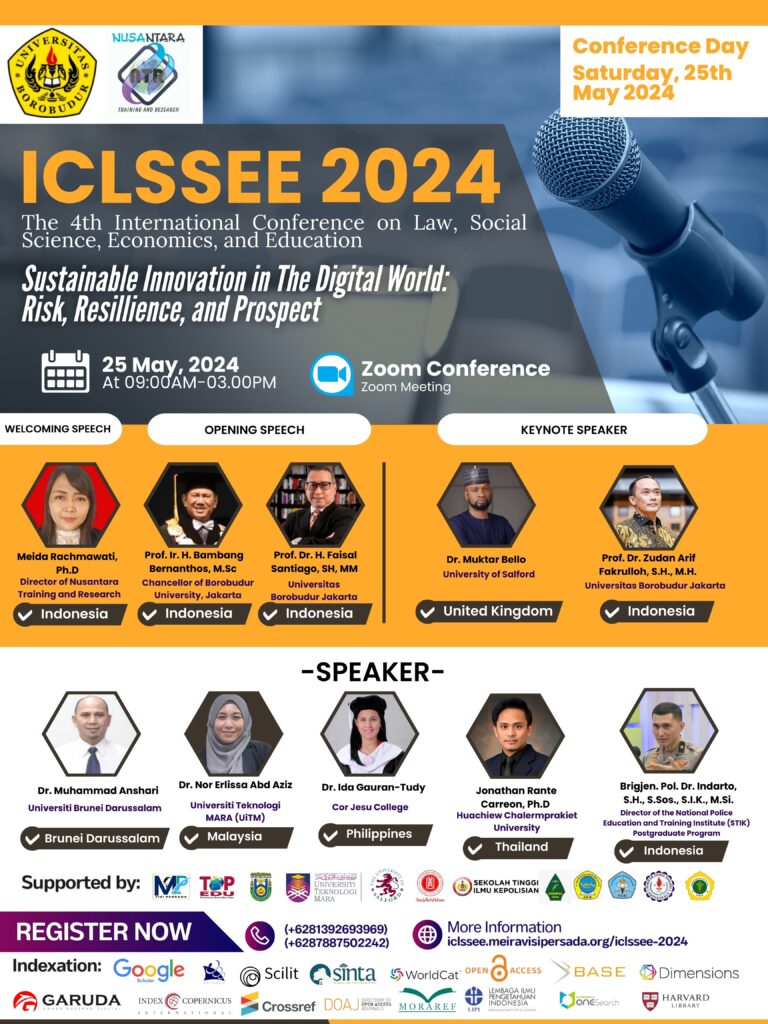The 4th International Conference on Law, Social Science, Economics, and Education (ICLSSEE 2024) is proudly organized by Borobudur University in Collaboration with Nusantara Training and Research. Mark your calendars as this prestigious annual event is set to take place on the 25th of May 2024.