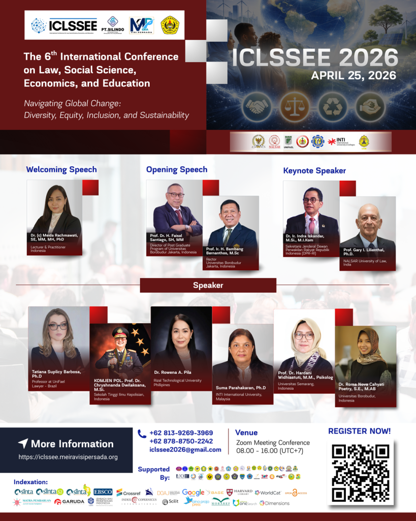 The 6th International Conference on Law, Social Science, Economics, and Education (ICLSSEE 2026) is a leading international academic conference that brings together scholars, researchers, policymakers, and practitioners to address the most pressing global challenges of our time. Under the theme “Navigating Global Change: Diversity, Equity, Inclusion, and Sustainability,” this interdisciplinary conference responds to rapid globalization, technological disruption, environmental uncertainty, and evolving socio-political dynamics. As a global forum for research dissemination and academic exchange, ICLSSEE 2026 provides a strategic platform for discussing innovative legal frameworks, inclusive economic development, social transformation, and transformative education systems that support sustainable global development.