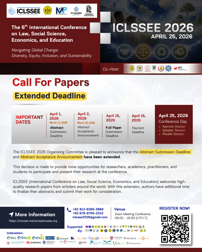 ICLSSEE (International Conference on Law, Social Science, Economics, and Education) welcomes high-quality research papers from scholars around the world. With this extension, authors have additional time to finalize their abstracts and submit their work for consideration.